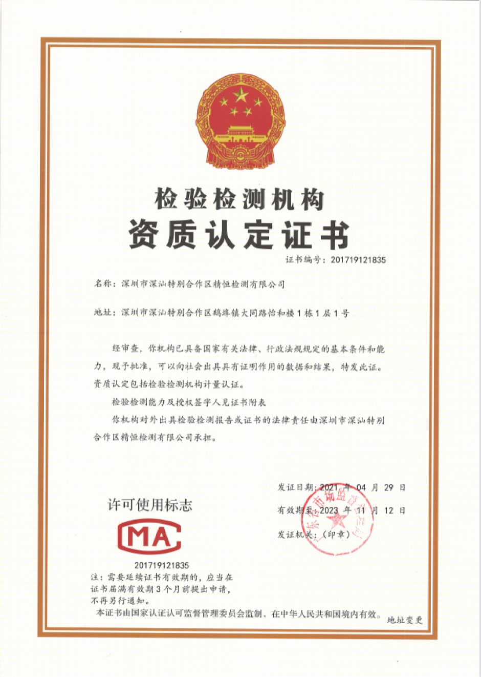 深圳市深汕特别合作区精恒检测有限公司前身为深汕特别合作区精恒工程检验有限公司,由爱游戏·体育-爱游戏(中国) 控股投资,于二零一四年十二月在汕尾市住房和城乡建设局备案(证书号:JCJG-2015003),从事检验检测工作,二零一五年深汕特别合作区招商引资,为了更好的服务于深汕特别合作区,方便于建设管理者严把建设工程质量关。根据国家相关法律、法规要求,当地也必须有国家认可的检验检测机构,作为一个深圳市检测经验丰富的检测机构,经汕尾市政府、深汕特别合作区管理委员会等领导审批后,作为第二批进驻深汕特别合作区企业。由于建设发展的需要,本公司于二零二一年十月二十七日更名为深圳市深汕特别合作区精恒检测有限公司。